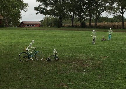 | Skeleton riders riding bicycles bicycle bikes bike halloween display decor katy trail boonville mkt farmhouse farm house |