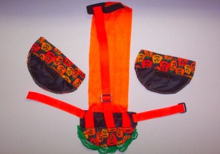 This Goose Diaper Holder Harness is made with A CUTE PUMPKIN AND OR JACK-O-LANTRIN print with green lace trim, backed with a waterproof fabric and it is oh so cute for any day of the year, but especially cute for October Days. This Goose Diaper Holder can be lined with a sanitary napkin, a human baby diaper, a folded newspaper page.