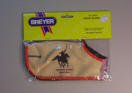 This one is kinda Tan with Orange trim and Black and Brown machine embroidery "Scottsdale Arabian Horse Show" On one side and "CHAMPION" on the other side. The Blanket is scaled to Traditional Size Model.