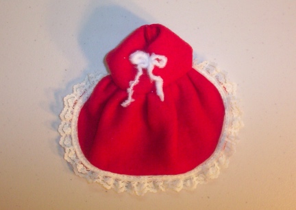 All of my items are my own design and pattern. This is a cute little idea was Mrs. Santa Inspired. It is made with RED fleece with White Lace trim and a cute little polar fleece bow.