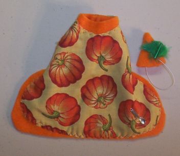 These little coats are made in a variety of ways. This one is a Cute PUMPKIN Print fabric over ORANGE Polar Fleece. It also has a little orange hat that has an adjustable elastic strap for under the chin with a green feather attached.