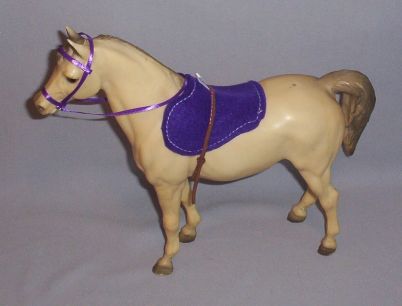 This is a hand crafted Purple Ribbon Bridle with a Purple Bareback Pad. It will fit most average horse breeds in the Traditional Size Breyer Horse. Please look at the photos.