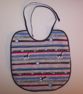 Here is a cute little baby bib. It is the same pattern (I made) that I used for my own children. It is a large bib (approx 11" x 11 1/2") that will catch the spills. It is backed with an absorbent quilted fabric and has a good length for straps to easily tie behind the baby's head.