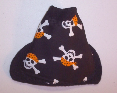 These little coats are made in a variety of ways. This one is a made with BLACK Polar Fleece with a cute PIRATE SKULL OR SKELETON AND BONES Print overlay.