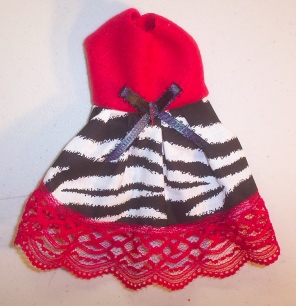 All of my items are my own design and pattern. This one is a cute little Zebra Print Dress with Red fleece top and Ribbon Trim.
