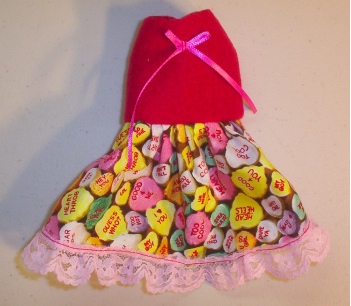 These little dresses are made in a variety of ways. This one is a Heart Candy Print with a Red polar fleece top complete with a little Pink bow and Pink lace trim.