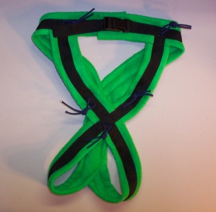 This multipurpose harness will fit most dog that weigh approx. 39-66 pounds. It is made with BLACK poly webbing with GREEN polar fleece padding. The black quick release buckle has extended polar fleece for padding.
