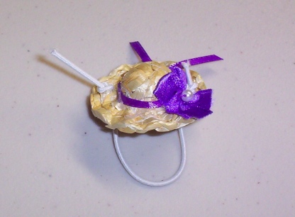 HOW CUTE IS THIS??!! This cute little Straw Easter Hat is trimmed with a Purple Ribbon and a Purple Flower with little bitty fake "pearl". This is a smaller hat then the one in the photo below, this hat is only 1 1/2" in diameter from brim to brim.