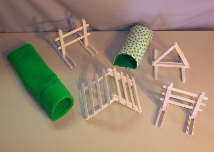 This set include TWO JUMPS, one has three bars and the other has two bars. It has a cute little TRIANGLE HOOP JUMP, and a darling little "A" FRAME!! It also comes with a CLOSED TUNNEL and an OPEN TUNNEL. This set comes to you in a PLASTIC STORAGE CONTAINER to keep it all together and safe. Seven pieces all together.