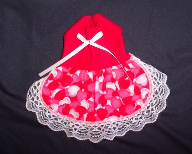 These little dresses are made in a variety of ways. This one is a Cute Heart Print Dress with Lace and a Tiny White Bow! I wish the photos showed the outfits better then they do.