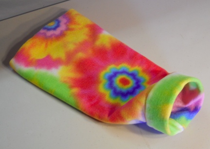 It is made with a Tye Dye Flower Power Print Polar Fleece with a plastic ring to keep the front open. The front has about a 5" diameter and is approx. 16" long.