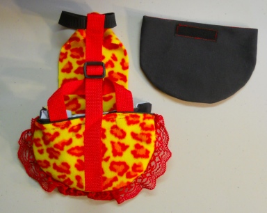 This one is for an older Gosling or a Duck and will fit your gosling for weeks. It is an Orange Leopard/Cheetah Print with red lace trim and oh so cute. They grow so fasssssst! If it arrives and it would be a bit too big, wait and try it on your baby goose again. This Goose Diaper Holder can be lined with a sanitary napkin, a human baby diaper, a folded newspaper page. The two liners and the Goose Diaper Holder are hand or machine washable, hang to dry.