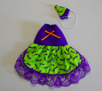 These little dresses are made in a variety of ways. This one is a Cute Halloween Print Dress with Purple Lace and a Orange White Bow! and a Matching hat with a Bats on it! I wish the photos showed the outfits better then they do.