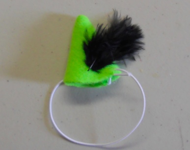 This is cute and even cuter with a Guinea Pig head under it. It is a Cavy sized Lime Green with Black Feathered hat. It stays on your pet's head with elastic. The elastic is left long when it arrives to you so that you can cut it or tuck it to fit your own Guinea Pig. If you have a dark colored Guinea Pig, use a permanent marker to color the elastic. Just let it dry well before putting the hat on your pet.