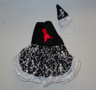 These little dresses are made in a variety of ways. This one is a cute Skeleton or Dancing Bones Print with a Black polar fleece top complete with a little Blood Red bow and White lace trim. It also comes with a matching hat that stays on the ratties head with adjustable elastic.