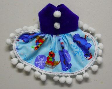 This one is a cute little Christmas Sesame Street Print Dress with Blue fleece top with Pom Pom trim and highlights.