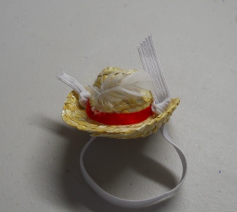 This little Straw Cowboy Hat has a Red Hatband and a White Feather. Once the elastic is cut to your Guinea Pigs size the feather will show up better.