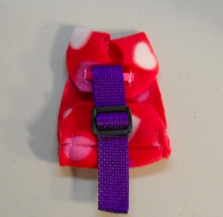 The Diaper Holder is held on, or holds together, with a small high impact plastic slide. Once set to size it will stay put. The slide is well padded by the 1" poly webbing and polar fleece. It makes this Goose Diaper Holder very comfortable and secure for the gosling wearing it.