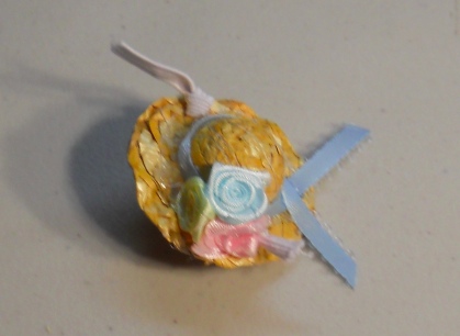 This is cute and even cuter with a rat head under it. It is a rat sized and has a little flowers with a ribbon hat band, quite a Lady Rat Bonnet. It stays on the ratties head with elastic. The elastic is left long when it arrives to you so that you can cut it or tuck it to fit your own rattie.