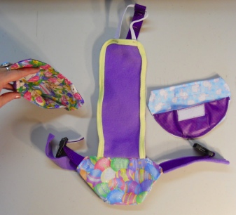 Duck Diaper Holders are, in my opinion, the only way to have a duck in the house, vehicle or a person's lap. This one is my own design that I fashioned for our own housegoose, Eden and Houseduck Phebe. The photo shows all the items you will receive.