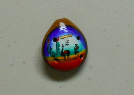 They come in different nicely painted prints and are made from a cotta. They measure about 1 3/4" long and 1 1/2" wide. A fun little whistle with a tiny hole for hanging from a string or chain.