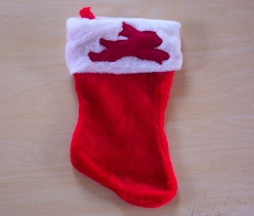 This is a fun item. It is a typical fuzzy Christmas Stocking with a Red Rabbit Cut Out in Oriental Print.