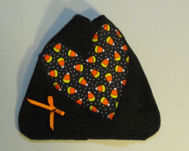 These little coats are made in a variety of ways. This one is a Cute Candy Corn Print fabric over Black Polar Fleece with a little orange bow on the hip.
