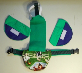 The Diaper Holder is held on, or holds together, with a small high impact plastic buckle and slide, backed with polar fleece. Once set to size it will stay put. It makes this Goose Diaper Holder very comfortable and secure for the goose wearing it with no big bulky or shiny parts.