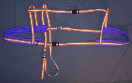 Goat Harness Facts: Webbing: Rainbw Polly Webbing Padding: Purple Polar Fleece Rings: Heavy Weight Welded Metal Buckles: Quick Release Heavy Weight High Impact Plastic