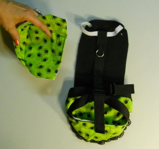 This Duck Diaper Holder Harness is made with A Cute Little Black Spider Print with Lace and matching two removable diaper inserts , backed with a waterproof fabric and it is oh so cute. This Duck Diaper Holder can be lined with a sanitary napkin, a human baby diaper, a folded newspaper page or other folded papers such as paper towels or other papers to be recycled.