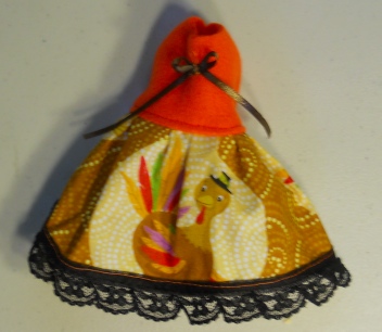 These little dresses are made in a variety of ways. This one is a cute Cartoony Turkey Print with a Orange polar fleece top complete with a Black lace trim. This item is made up and ready to ship.