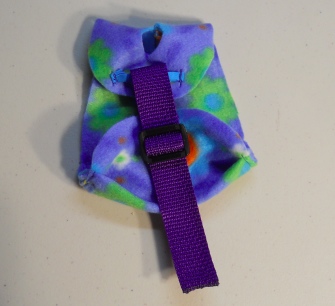 The Diaper Holder is held on, or holds together, with a small high impact plastic slide. Once set to size it will stay put. The slide is well padded by the 1" poly webbing and polar fleece. It makes this Goose Diaper Holder very comfortable and secure for the gosling wearing it.