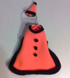 All of my items are my own design and pattern. This is a cute little idea was Santa Inspired. It is made with Orange fleece has three Black pom poms with Black polar fleece trim. The hat has adjustable elastic.