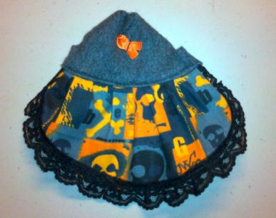 These little dresses are made in a variety of ways. This one is a Skull Print trimmed with Black Lace and has a Gray polar fleece top complete with a little bitty Orange Cross Over Bow. THIS ITEM IS MADE UP AND READY TO SHIP, IT WAS HAND CRAFTED IN OUR NW SD NON SMOKING HOME FROM PATTERNS I CREATED. The item you receive may vary slightly from photo.