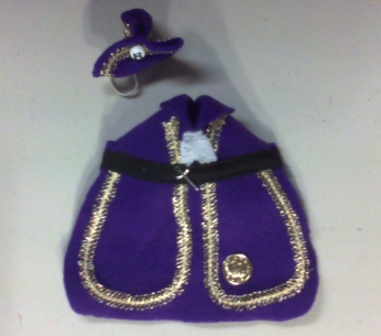These little costume is adorable with a little Purple fleece Pirate Coat complete with Fancy Gold colored Trim front,a PiRATe Captain's Hat with an "R" and a little Metal Dagger at the waist. Does the R stand for Rattie, or is that short for Arg! You decide. There is a lot of hand work in this outfit!