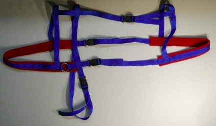 Goat Harness Facts: Webbing: BLUE Polly Webbing Padding: RED Polar Fleece Rings: Heavy Weight Welded Metal Buckles: Quick Release Heavy Weight High Impact Plastic