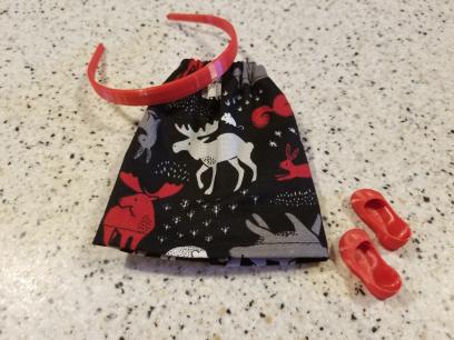 With this lot you will receive what you see in the photo. The cute little Winter Woodland Print Skirt, the RED Pair of Shoes (that click on from the little toe over and STAY on the foot!) as well as the matching Headband.