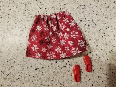 With this lot you will receive what you see in the photo. The cute little Snow Flake Print Skirt, the RED Pair of Shoes (that click on from the little toe over and STAY on the foot!).