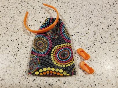 With this lot you will receive what you see in the photo. The cute little Multi Color Wheel Print Skirt, the Orange Pair of Shoes (that click on from the little toe over and STAY on the foot!) as well as the matching Headband.
