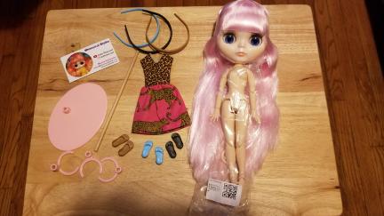 THIS BLYTHE DOLL IS NEW AND STILL IN THE PACKAGING. THE PLASTIC HEADBAND NOR THE BODY PLASTIC HAS NEVER BEEN OFF SINCE FACTORY SEALED. HER FACE WAS UNWRAPPED ONLY LONG ENOUGH FOR PHOTOS TO VERIFY ALL IS WELL WITH THIS DOLL.