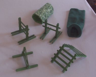 This set include TWO JUMPS, one has three stationary bars and the other has two stationary bars. It has a cute little TRIANGLE HOOP JUMP, and a darling little "A" FRAME!! It also comes with a CLOSED TUNNEL and an OPEN TUNNEL. This set comes to you in a PLASTIC STORAGE CONTAINER to keep it all together and safe.