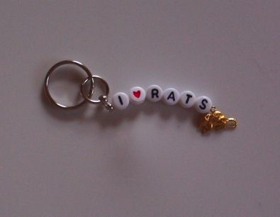 I make and design most of the items I sell including but not limited to this I (heart) RATS Key Chain with a rat charm. The key chain is approx.3" long and has one gold toned 1" rat charm. The keys go unto a split ring that is about 3/4".