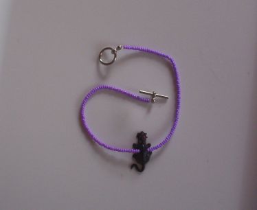 This is a cute little bracelet made of purple seed beads with a black approx 1" charm. The bracelet is approx. 8 1/2" long.