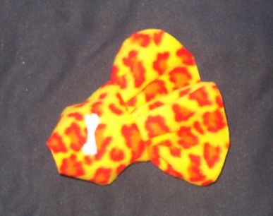 These little dresses are made in a variety of ways. This one is a Bright Yellow/Red/Orange Leopard Print Dress with a Cute little "Old Bone" cut out. It closes with velcro under the ratties waist.