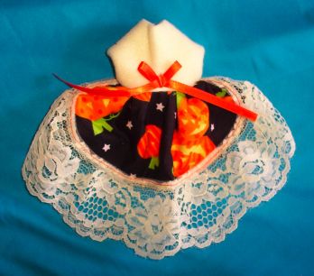 These little dresses are made in a variety of ways. This one is a Pumpkin Print trimmed with yellow lace and has a Yellow polar fleece top complete with a little Orange bow.
