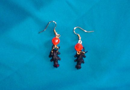 These are fun. They are little black rats are highlighted orange beads. The black rattie are approx 1". The photo angle is not great, much cuter when hanging from ears. They were designed made by me with gold toned fish hook type pieced earrings.