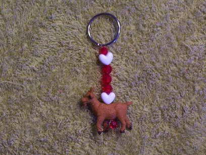 I LOVE THIS ONE!! This is a cute little split ring keychain with a cute little plastic goat. It has two little heart shaped beads as well as beautiful red "ruby" beads. The goat on this one is a little larger then the other keychains have.