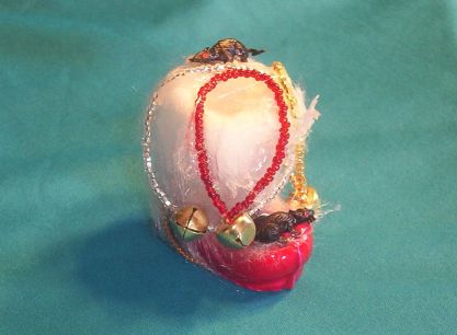 This one of a kind Santa Boot and Rats Ornament is also adorned with "silver", "gold" and Shiny Red beads as will as little ringing bells.