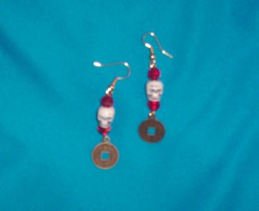 These are some cute earrings! They hang down just over 1 1/2" from the earring wire. The white skulls are set off by the Ruby like Red beads on either end of it with a cute little antique Chinese coin charm...every Pirates delight! They were designed made by me with gold toned fish hook type pieced earrings.