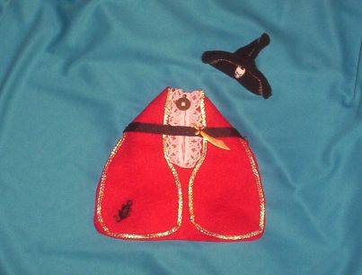 These little costume is adorable with a little red fleece top complete with lace front,a PiRATe Captain's Hat with Skull Bead and a little Metal Sword at the waist. It also has a Chinese pirate coin at the neck and a little black rattie on the hip. There is a lot of hand work in this outfit!